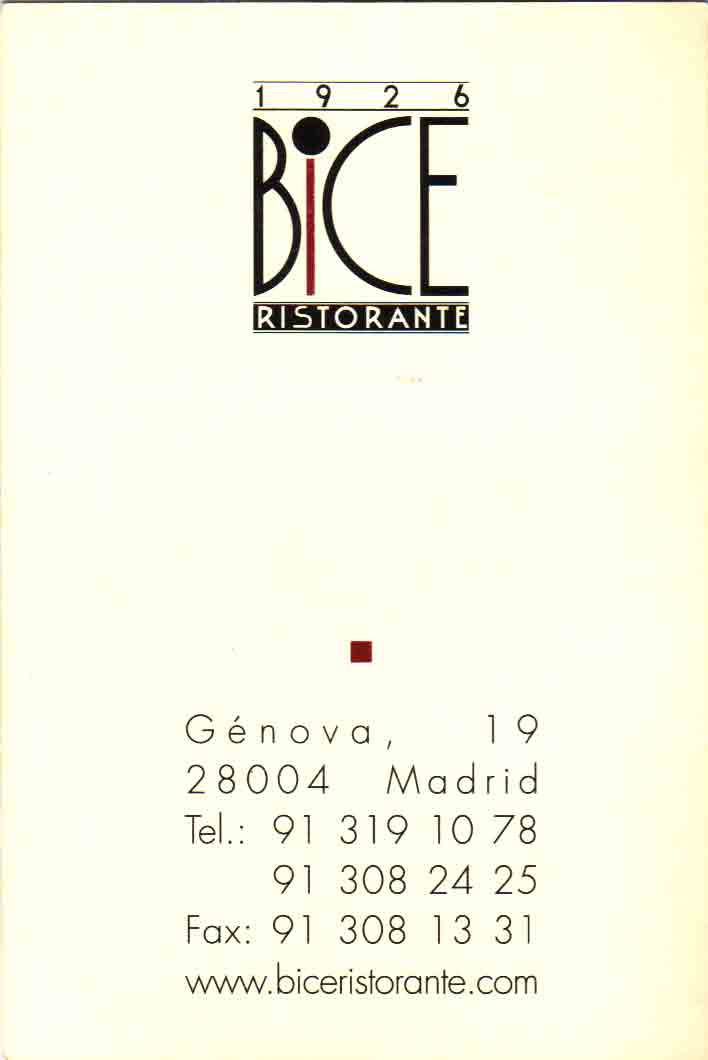 "Bice Madrid forma parte de la cadena Internacional Bice, que cuenta con restaurantes en Miami, Nueva York, Chicago, Palm Beach, Las Vegas, Montreal, Milan, Londres, Amsterdam, Monte Carlo, Tokio, Singapur, Dubai, Buenos Aires, Santiago de Chile, Curtiva (Brasil) y México. La alta cocina italiana, llena de registros mediterráneos rescatados de las recetas clásicas y desarrollados por Rugieri para Bice, resucitan unas combinaciones de sabores que invitan a la verdadera degustación."