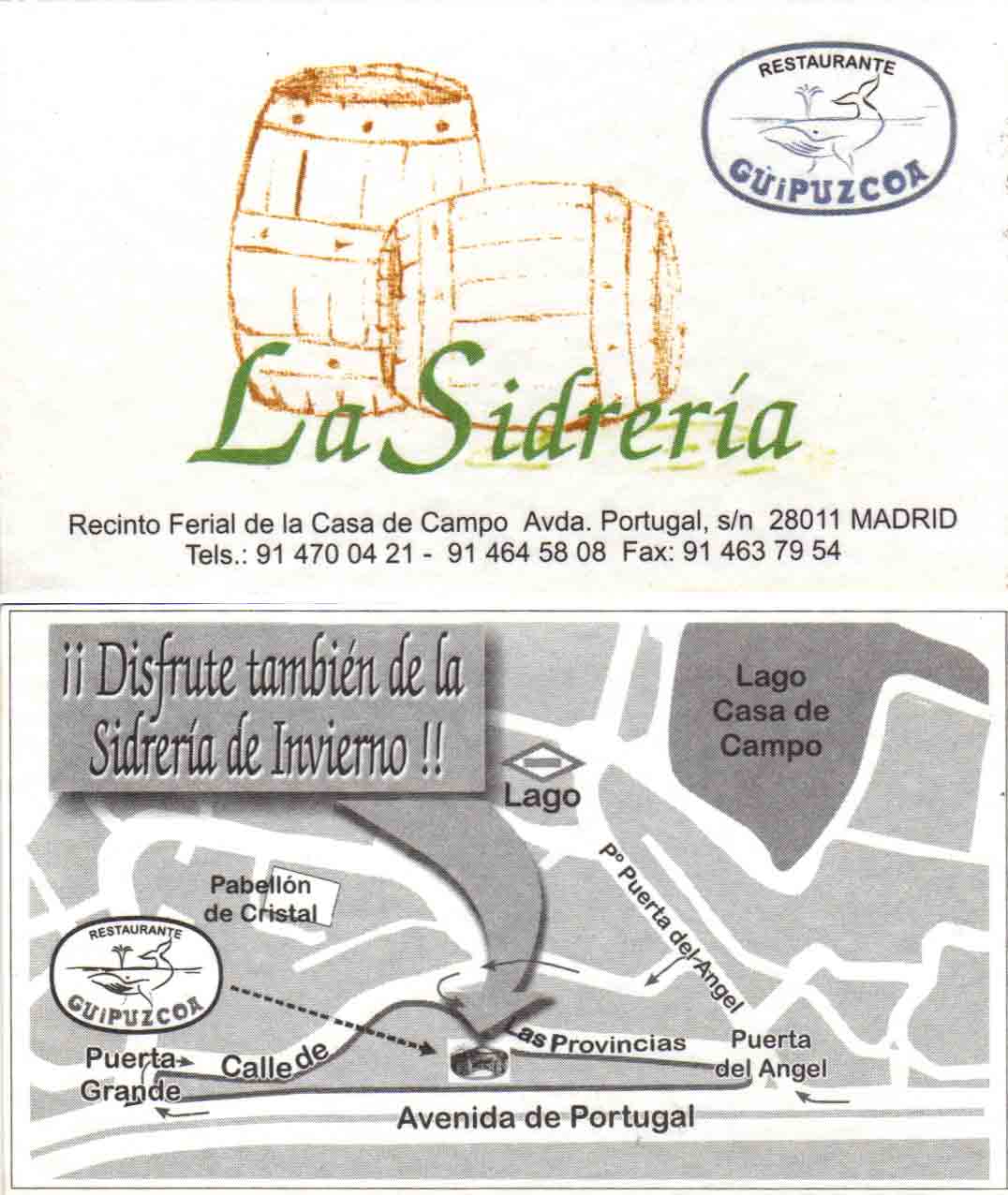 "La sidrería vasca tradicional se ha traslado a Madrid, el restaurante Guipúzcoa fue pionero en instalar este concepto de la sidrería y caseríos guipuzcoanos situados en los alrededores de Donosti. La Sidrería del Guipúzcoa es el prototipo de la más pura cocina vasca tradicional, basada en la calidad de sus materias primas y una sencilla pero esmerada elaboración. El menú de La Sidrería, con la tortilla de bacalao y chuletón de carne roja, es el protagonista de la carta. Desde las “kupelas” (barricas) los comensales pueden escanciar directamente al vaso la sidra natural de Zapiain, o bien llevarse a la mesa una jarra recién escanciada de forma ilimitada a un precio fijo irresistible. Nuestra carta ofrece habitualmente platos creativos elaborados con setas: Boletus, Russulas, setas de primavera, colmenerillas, perretxikos y un largo etcétera. Una cita imprescindible durante la época estival es disfrutar de La Parrilla del Restaurante Guipúzcoa en nuestra terraza-jardín. El aroma inconfundible del carbón de encina envuelve sus pescados y carnes. Los platos de la Cocina Vasca del Restaurante Guipúzcoa son sencillos y nobles como sus propios orígenes. En ella se cocinan los pescados más comunes como la merluza, el besugo, el rape o la lubina, e incluso los humildes como las sardinas y las anchoas. Todos ellos pueden ser servidos con las cuatro salsas tradicionales, la roja a la vizcaína, la blanca en el pil-pil, la verde en la merluza y la negra en los chipirones que nunca faltan en nuestra cocina. Para terminar los reyes de la repostería casera: arroz con leche y queso con nueces, hacen las delicias de nuestros comensales."