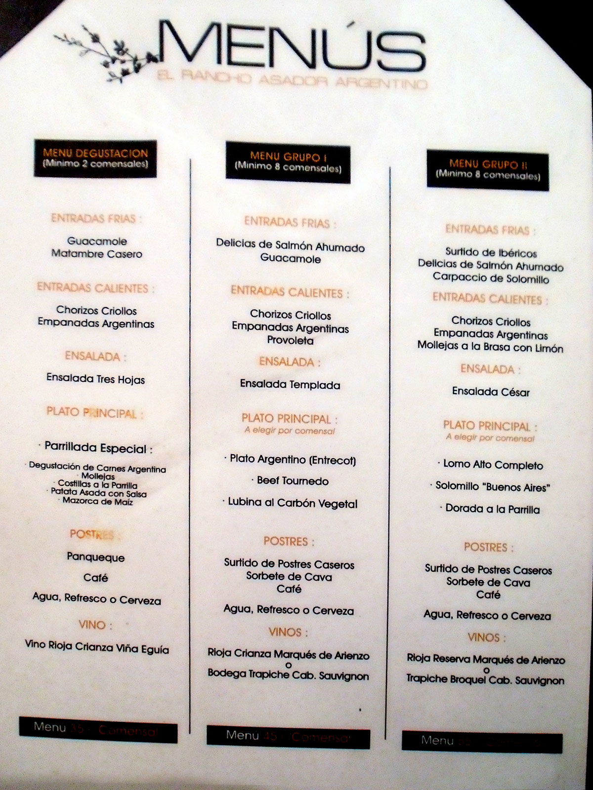 Local: Está situado en los bajos de un edificio de nueva construcción. Desde el exterior, la fachada se divide en cinco paños. El central, con paredes de cristal, deja ver el interior del bar-recibidor y través de una puerta de madera rústica, da paso al local. Los otros cuatro presentan cada uno un gran ventanal acristalado, con una franja inferior mate que, permite pasar la luz a la vez que preserva la intimidad de los comensales. Una vez dentro, los salones se reparten a ambos lados. El situado a la derecha, donde cenamos, da paso a otros dos, uno interior con una pantalla de proyecciones al fondo, y otro exterior que, además de mesas independientes alberga pequeños reservados y una gran fotografía de la selección argentina de futbol. La separación entre comedores se realiza mediante cortinas, que al parecer permanecen siempre abiertas. La decoración del local es moderna, con suelos, paredes y techos de color marrón chocolate. Está bien iluminado con luces procedentes de lámparas bajo el piso, arañas y focos en la escayola y apliques de luz indirecta en los paramentos. Las mesas, redondas y rectangulares, están cubiertas por manteles blancos con el logotipo del local en bajorrelieve. El espacio entre ellas es suficiente. Las sillas, metálicas, tienen un respaldo alto y están enfundadas en tela beige claro del mismo tono que los bajo manteles. La vajilla sencilla, blanca, con platos de forma más cercana a un cuadrado que a un círculo. Copas clásicas grandes y cubertería normal.