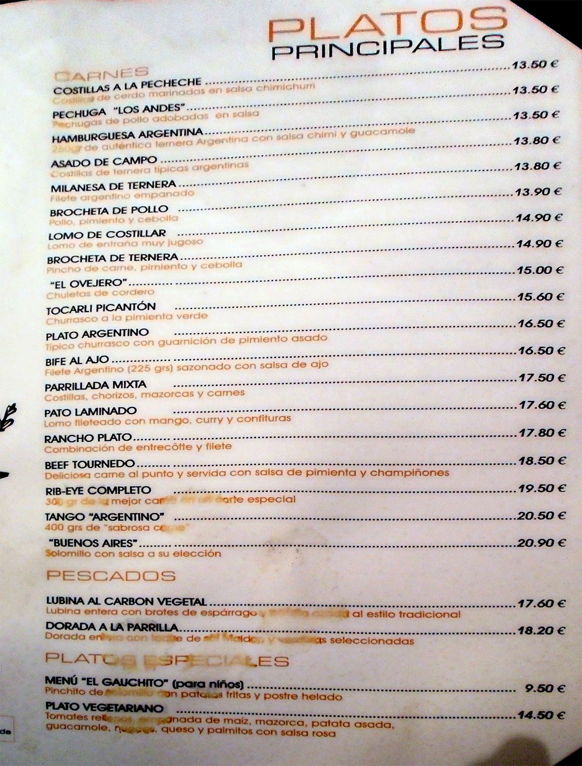 Lomo alto completo (carne joven e insípida); Solomillo "Buenos Aires" (<regular, lo sirven con patata "super cocida"); Dorada a la parrilla.