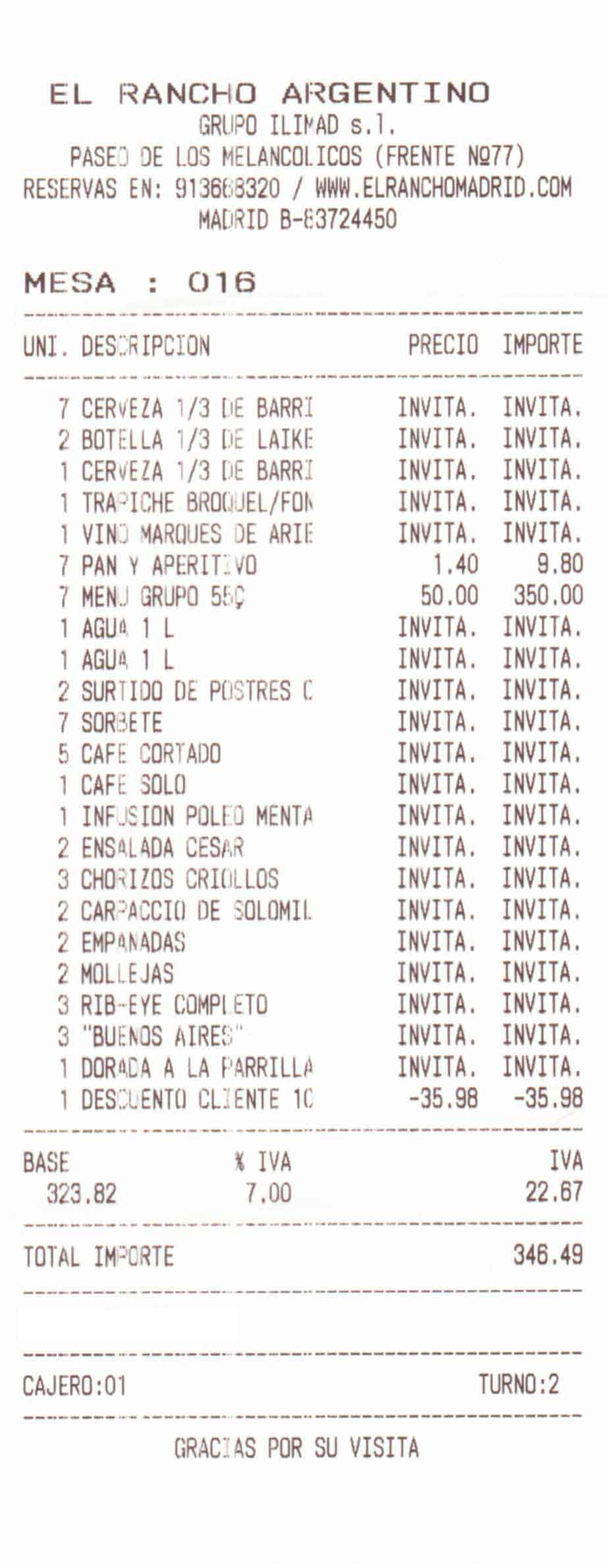 Otros: Nos hicieron un descuento del 10% por reservar por internet. Aunque en la nota pone invitación, las cañas de la entrada están incluidas en el menú. Nos permitieron pedir el menú "GRUPO II" aunque fuimos sólo siete. Aparentemente, en la factura, nos cobran el pan a parte del menú, pero no es así ya que lo descuentan previamente. [(50+1,4)+I.V.A (7%) = 55].