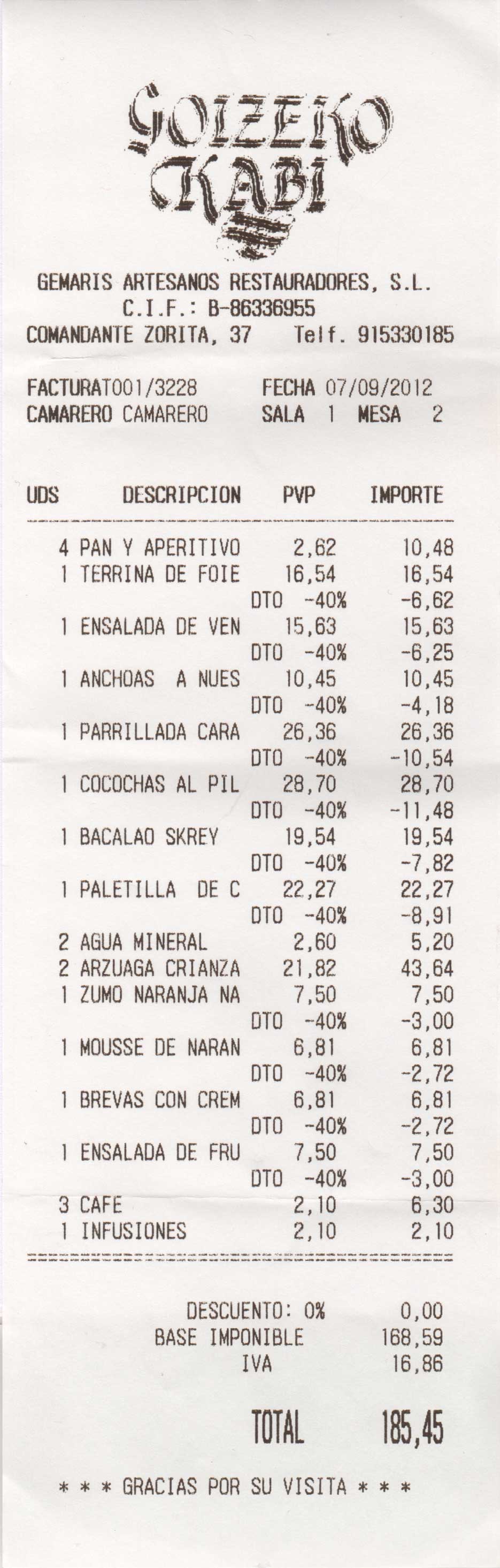 el I.V.A. de la suma total. Hay dos postres que en la factura figura