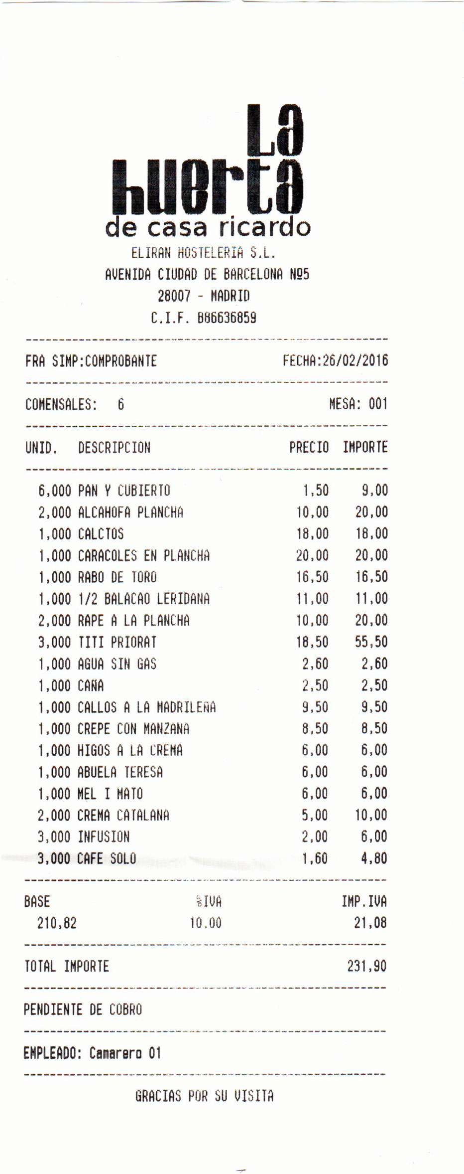 € cada uno y tres infusiones a 2,00 € cada una. Pusieron unas chocolatinas