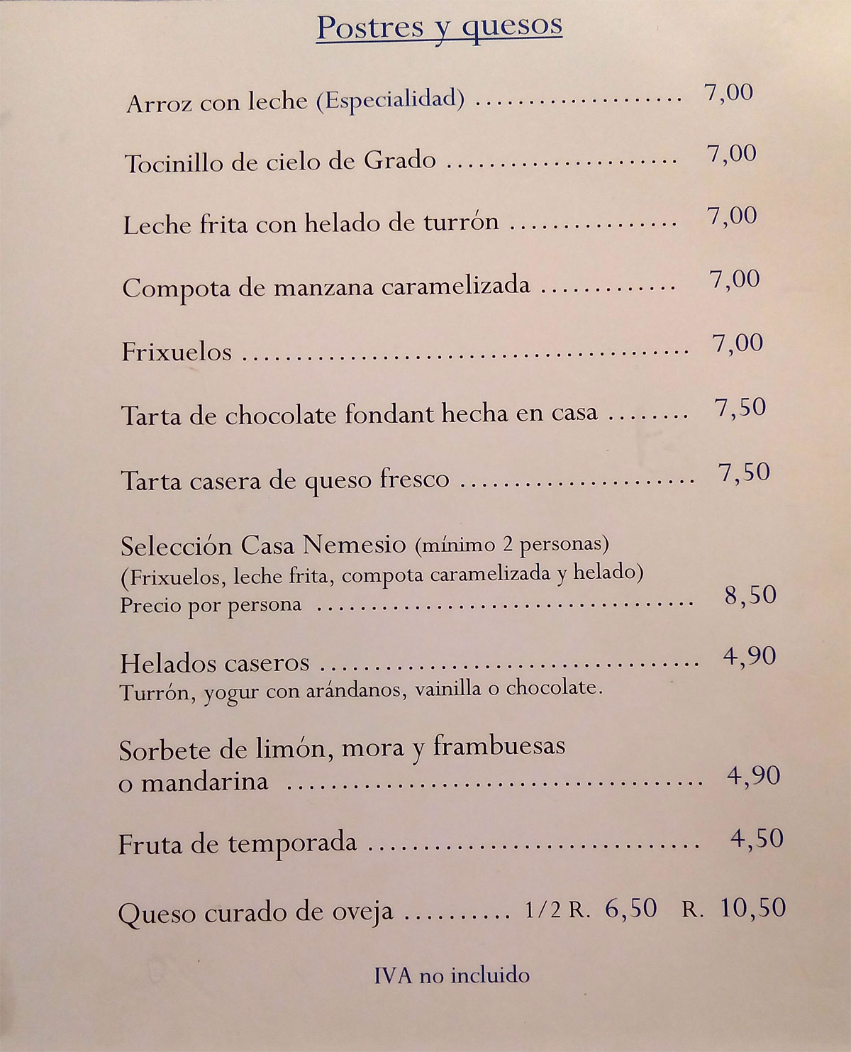 pdf. No contiene los postres. No incluye el I.V.A. en los precios.