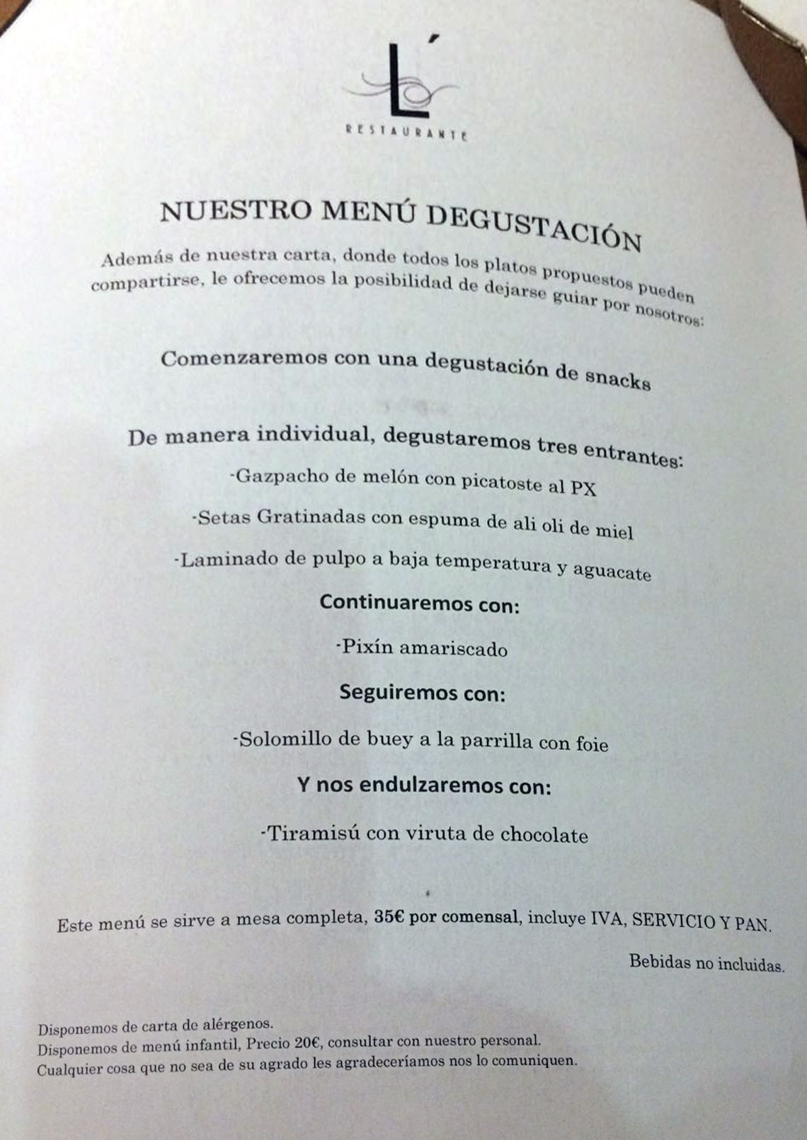 a 35,00 €, I.V.A. incluido, que consta de una degustación de snacks,