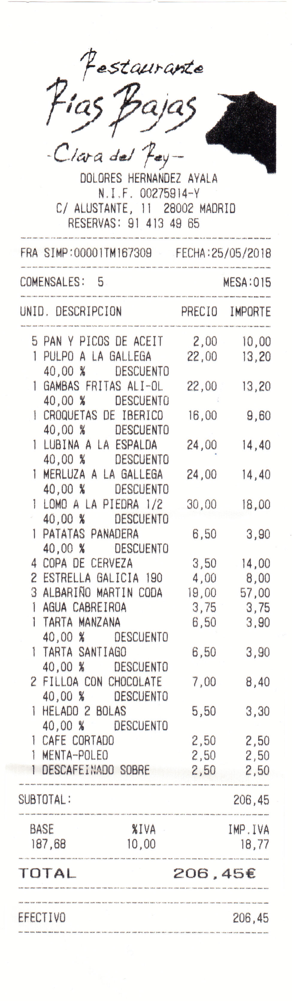 Descuentos: Al reservar por "eltendor", se aplicó un 40% de descuento sobre la comida. Nos hemos ahorrado 70,80 € en la cena o lo que es lo mismo 14,16 € por persona.