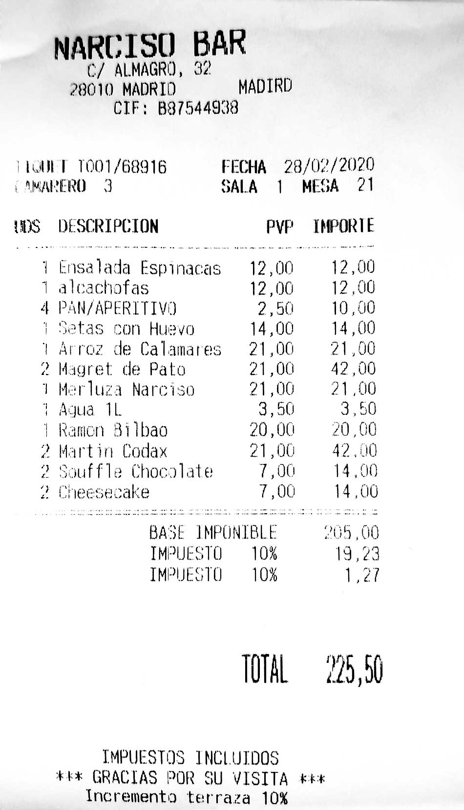 total del precio en factura de la cena, sin incluir las cañas