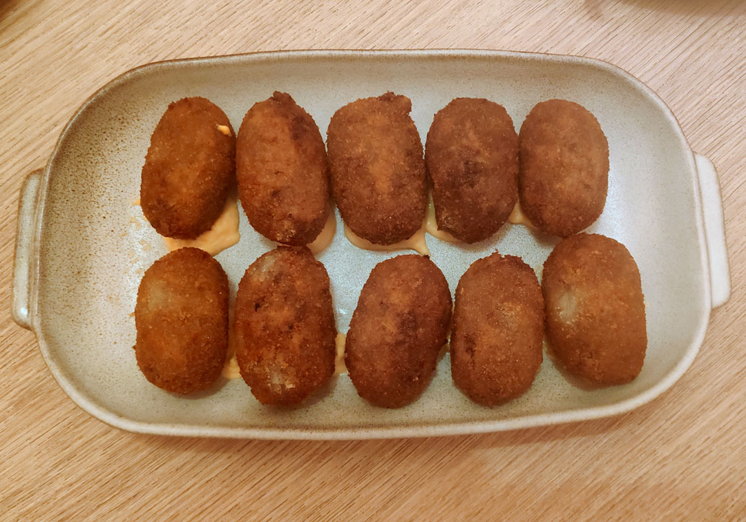 Con ellos pusieron de aperitivo aceitunas empanadas fritas. Algo