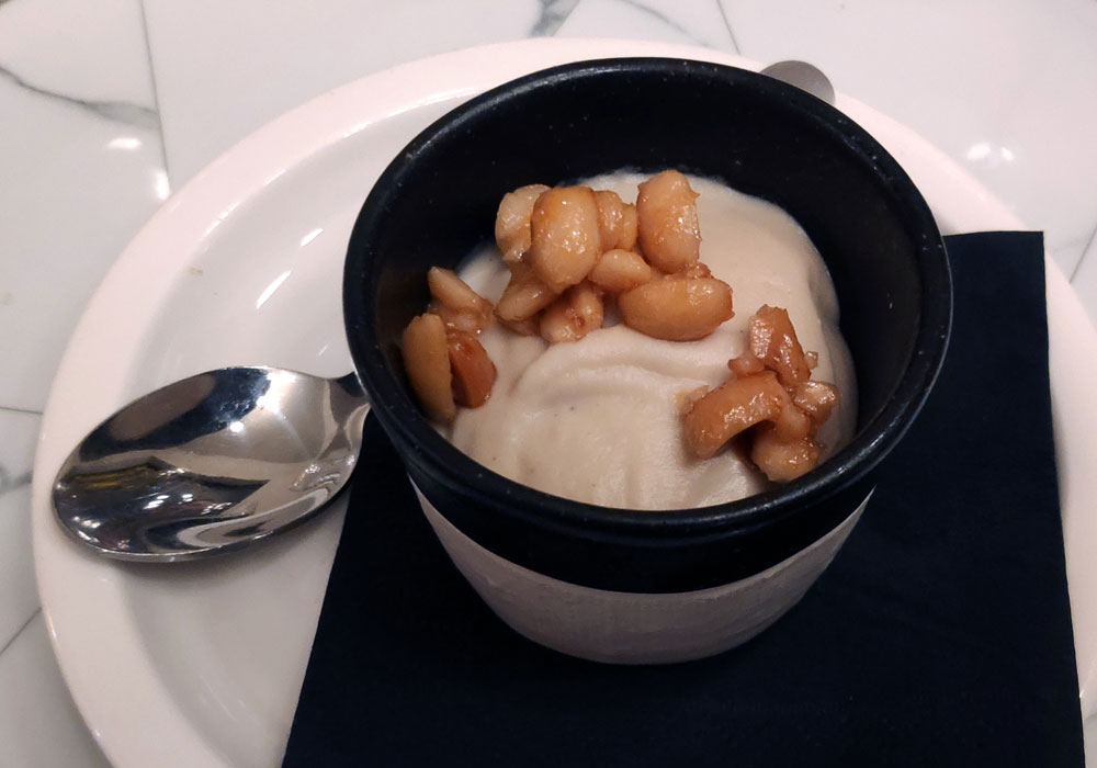 sobre la salsa densa de avellanas. Por encima trozos de avellana partida. Estaba