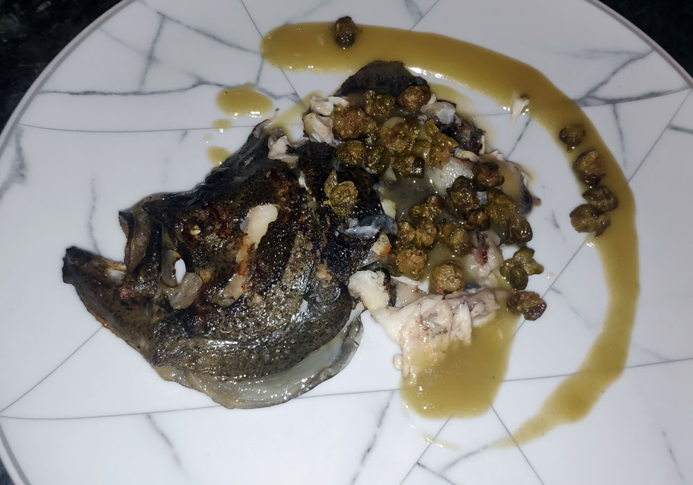 La cabeza del rodaballo la sirven con salsa