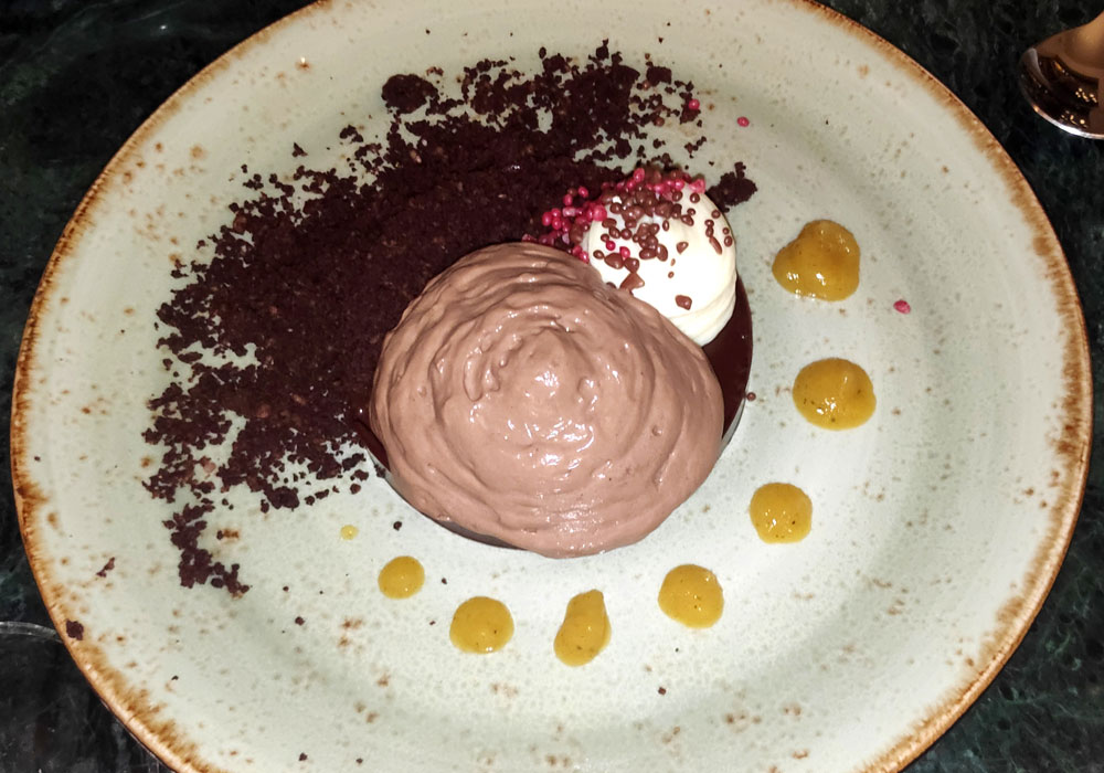 de chocolate negro y sobre ella una crema de chocolate con leche junto
