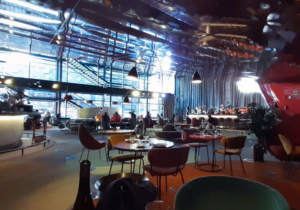 nube metálica de color rojo, está la zona del restaurante