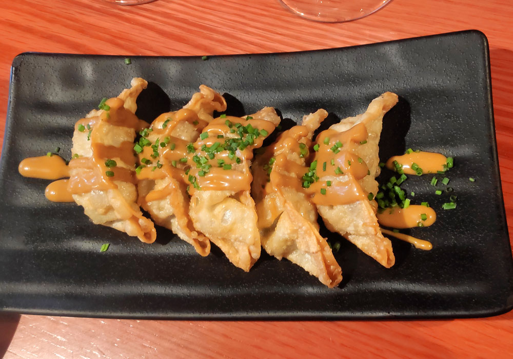 con cinco guiozas. Por encima llevan una salsa y cebollino picado. Estaban