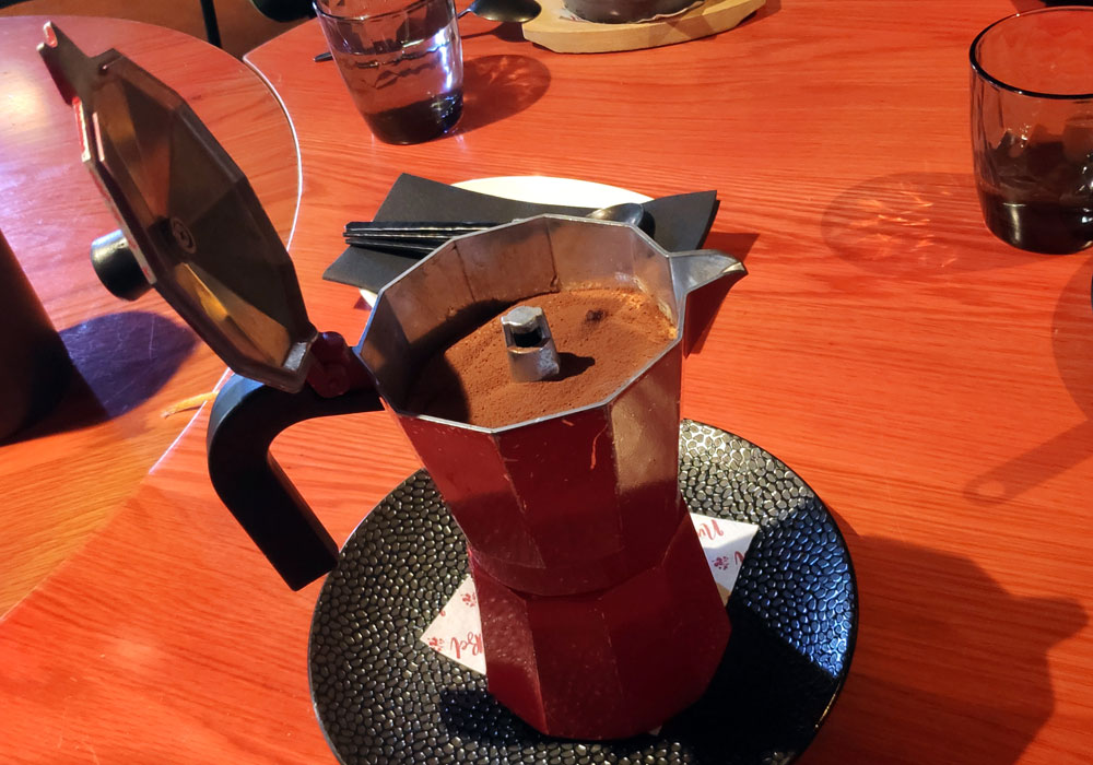 traen en una cafetera italiana clásica. Es otro trampantojo