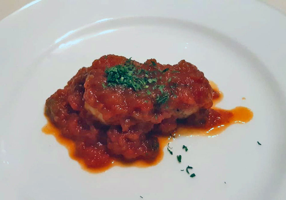 de pescado cubierto por la salsa de tomate y un poco de perejil picado.