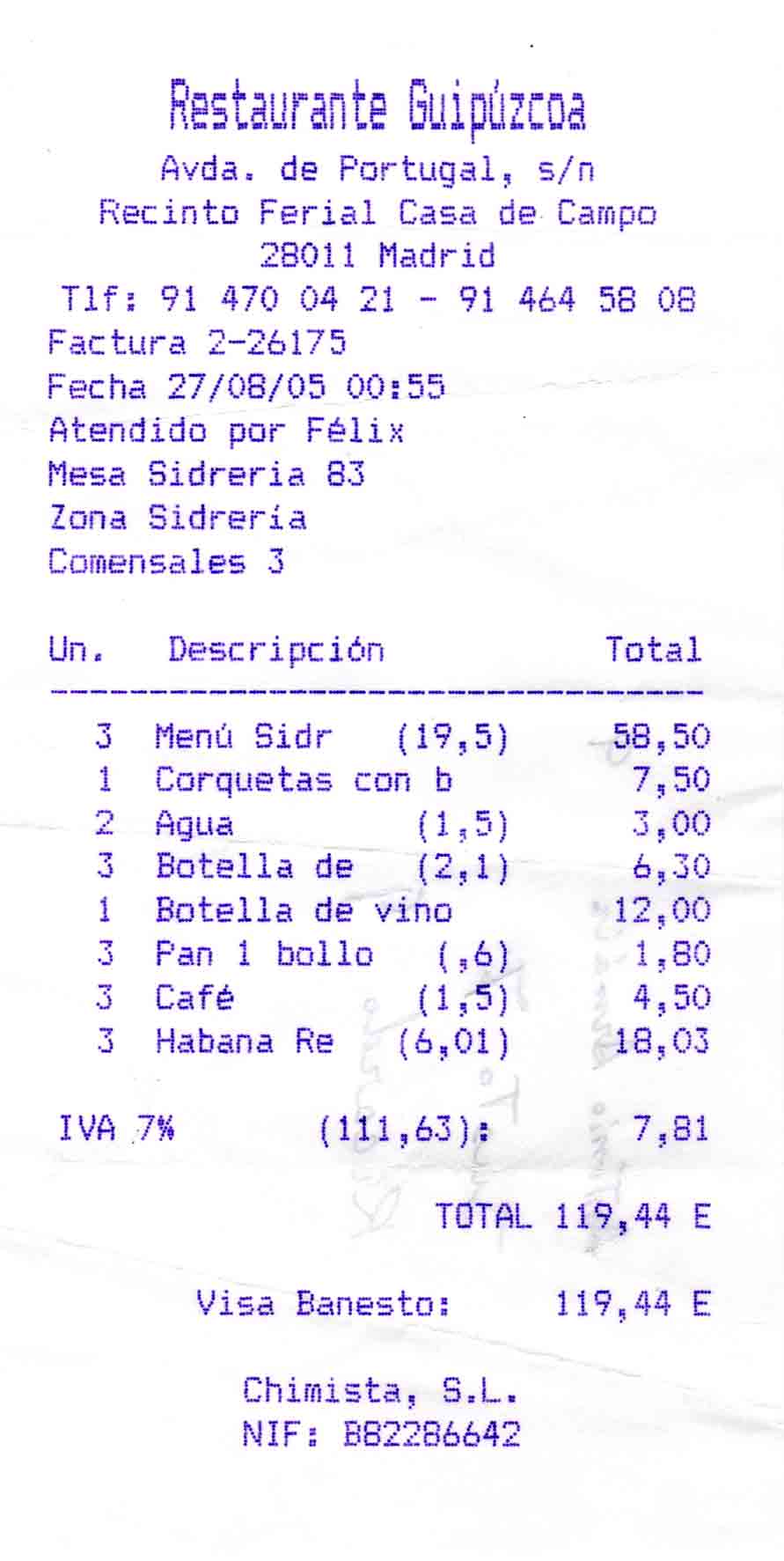 Sidra: Se pidieron tres botellas a 2,25 € cada una.