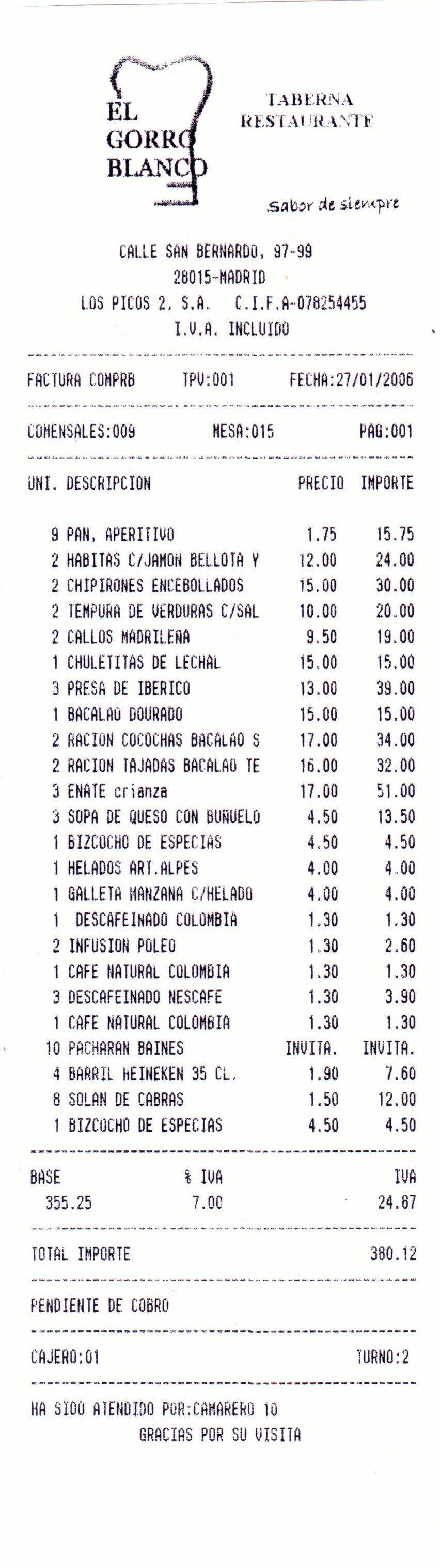 total del precio en factura de la cena, sin incluir las cañas,