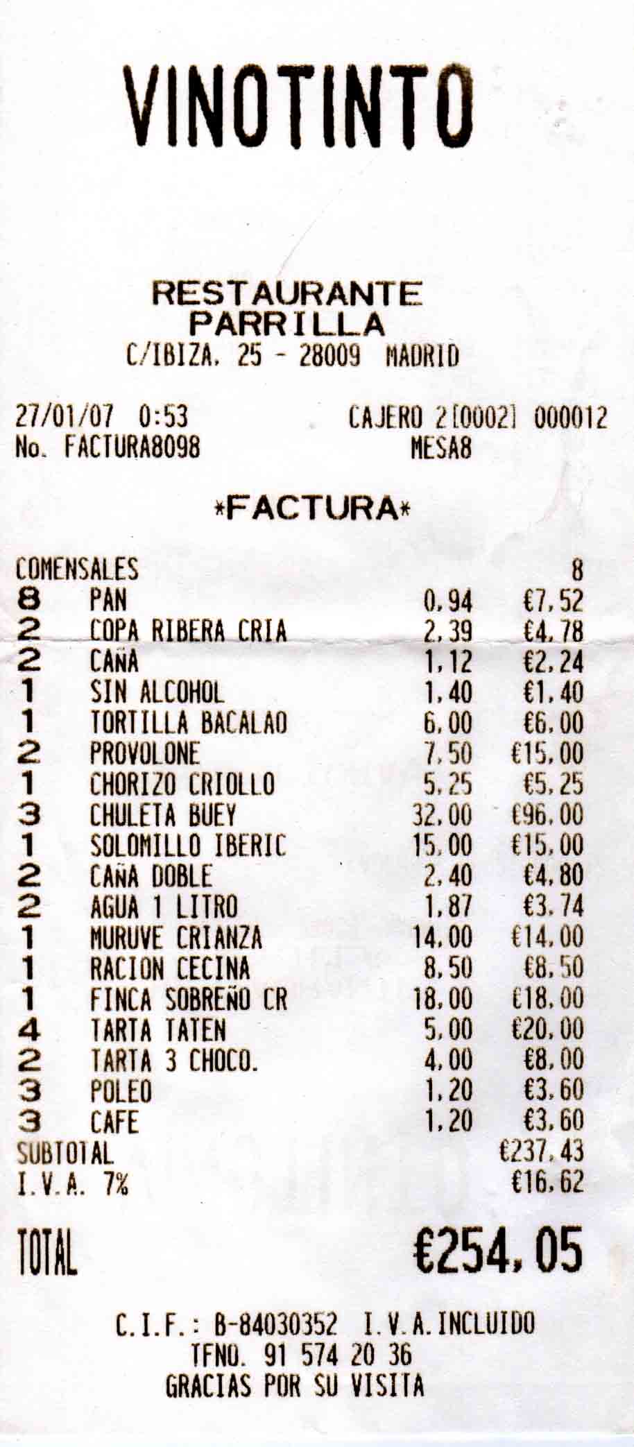 Finca Sobreño crianza: Tinto con denominación de origen Toro, de las bodegas Sobreño (www.sobreno.com). Está elaborado con uva 100% Tinta de Toro. Tras nueve meses de crianza en barrica de roble americano, reposa en botella en torno a medio año. Se pidió una botella. La cobran a 19,26 €.