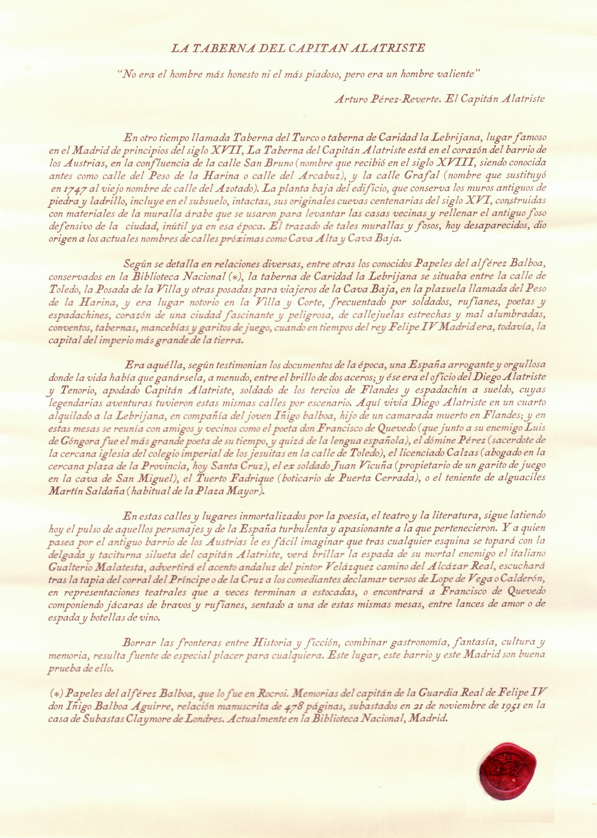el local como taberna y dedicarla al "Capitán Alatriste".