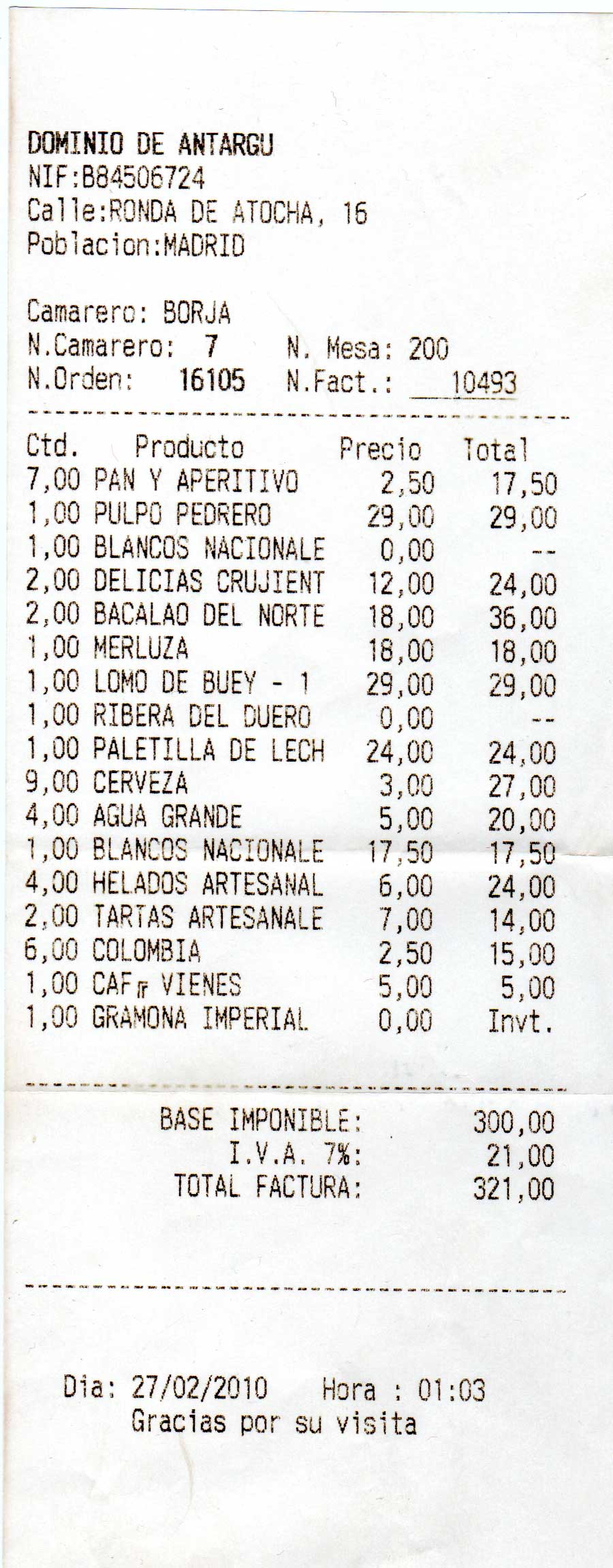 Pazo Barrantes: Vino blanco con D.O. Rías Baixas. De las bodegas Pazo de Barrantes (www.marquesdemurrieta.com). Está elaborado con uva 100% Albariño. Gustó menos este vino que el ribeiro. Sólo tres de de los siete comensales se decantaron por él. Se pidió una botella a 18,72 €. El precio aproximado de venta al público en las tiendas es de 11,50 € la botella. El restaurante lo vende más de un 50% adicional del precio de venta al público en un comercio.