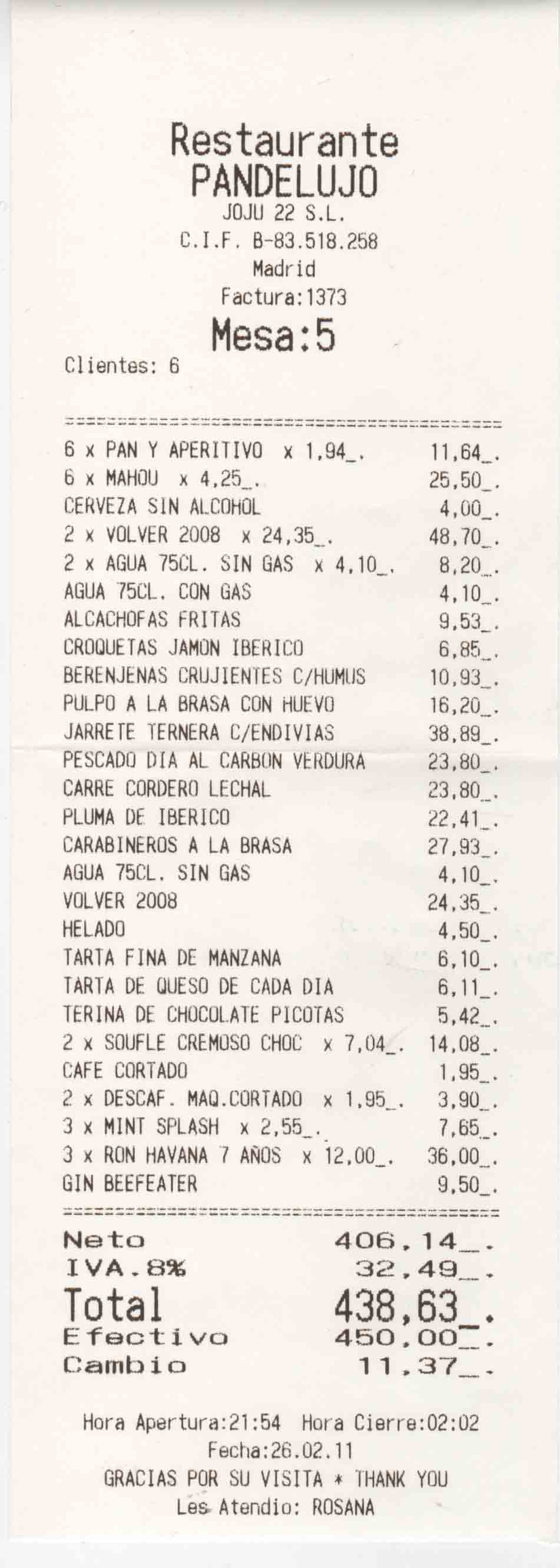 La carta y la factura: El I.V.A, como debe ser, se incluye en los precios de la carta, sin embargo en la factura aparecen sin él. Las cervezas y las copas que últimamente tomamos en el propio restaurante suponen un incremento grande en la factura que, aunque no se deben tener en cuenta, condicionan a la hora de puntuar el restaurante. En este caso hemos pagado por las copas y cervezas un 22,6 % adicional del coste de la cena. La cena sale a 59,6 € y la bebida extra a 13,5 €.