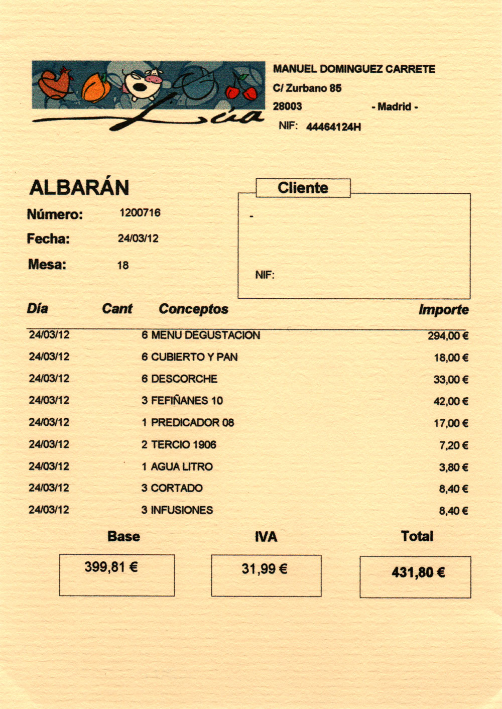 I.V.A, 8%, se incluye en los precios del menú.