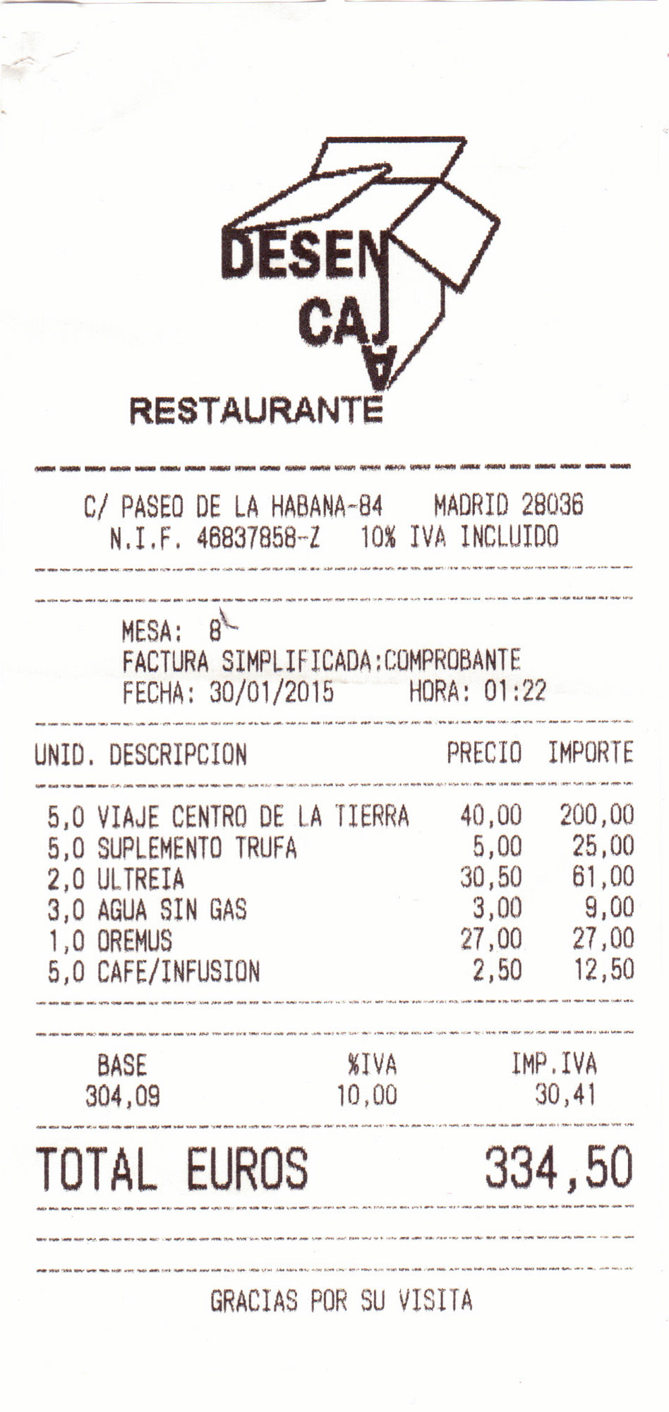total del precio de la cena, sin incluir cañas ni copas, el