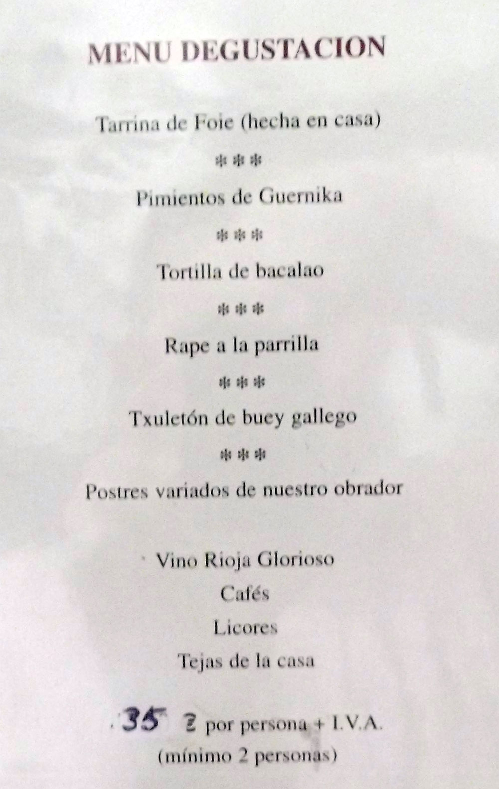 menú, el vino que figura es el Rioja Glorioso, sin embargo
