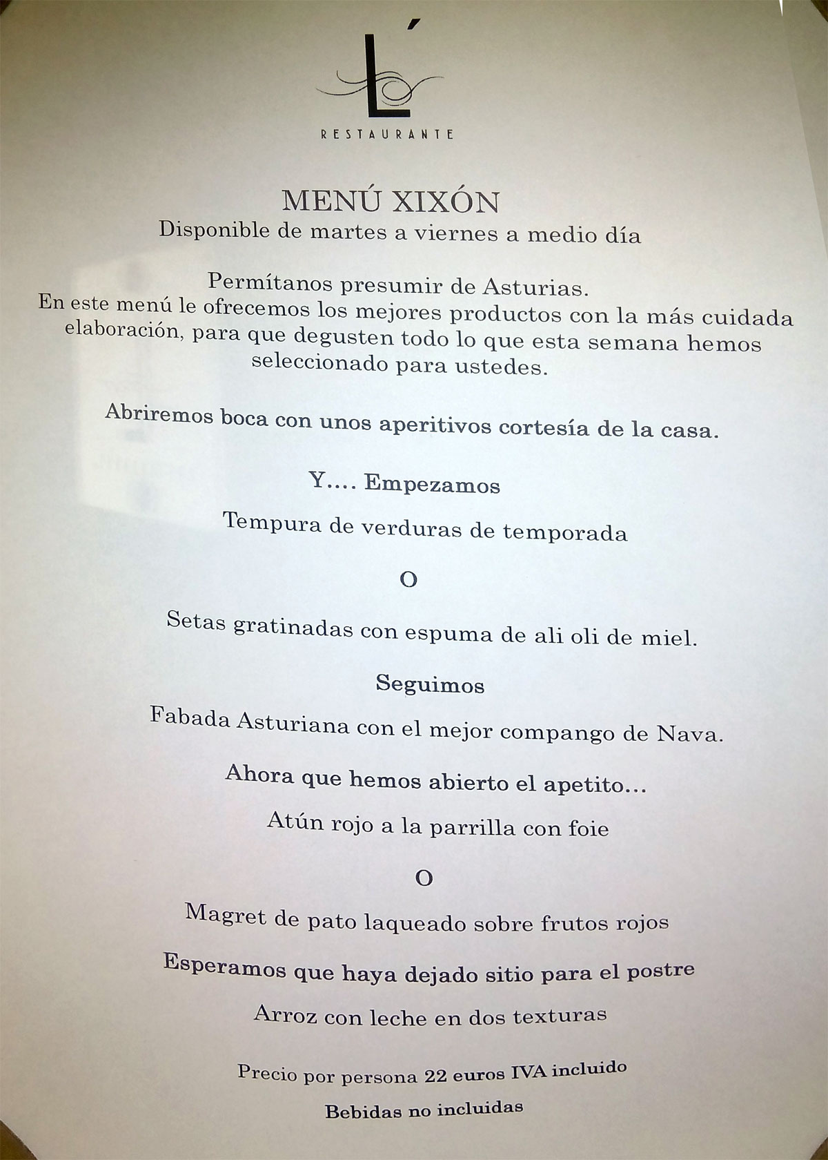 tres entrantes, pescado, carne y postre. No incluye