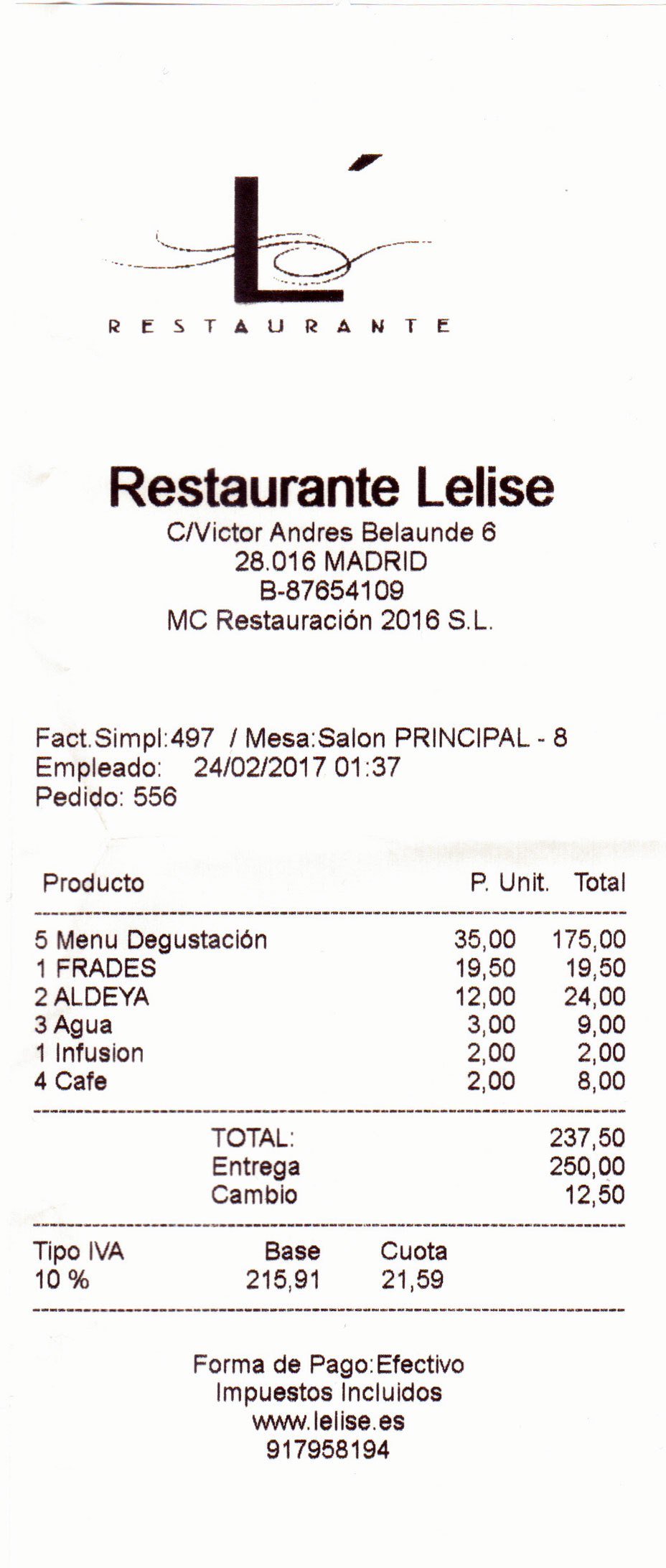 La carta y la factura incluyen el I.V.A. como debe ser.
