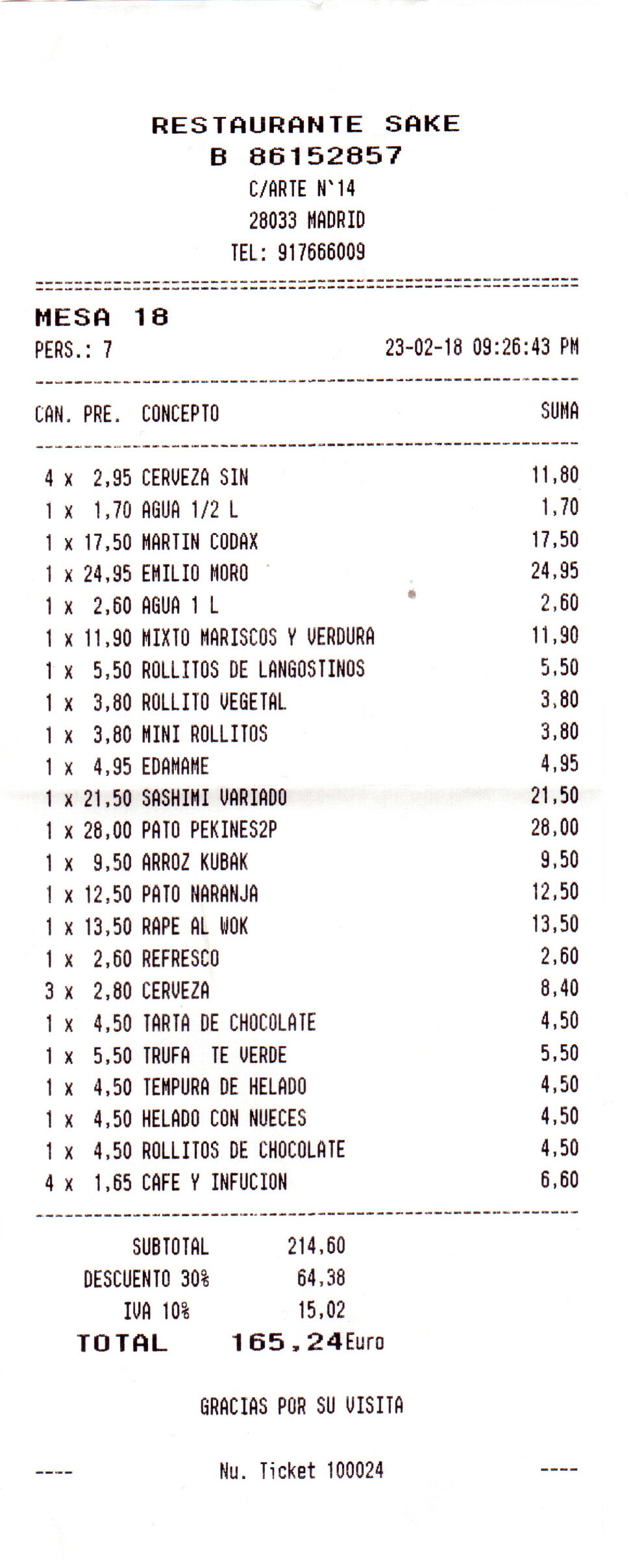 Pedimos una botella. El precio en la carta es de 27,45 €.