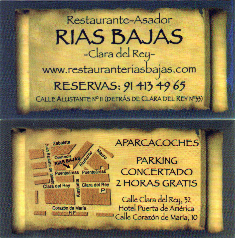 "En 1979, `RÍAS BAJAS´ fue el primer restaurante de España en servir carne a la piedra. Desde entonces es nuestra especialidad y, gracias a ella, somos reconocidos. Nos esforzamos por conseguir materias primas de primera calidad, localizando las mejores carnes del norte de España, acercándolas a su mesa. Esperamos que lo disfruten. Traemos cada día los mejores pescados y mariscos de la lonja, seleccionando los productos que mejor encajan con nuestra oferta. Además de éstos, solemos tener algunas opciones fuera de carta. Pregunte a nuestro personal y les indicarán cuales son."