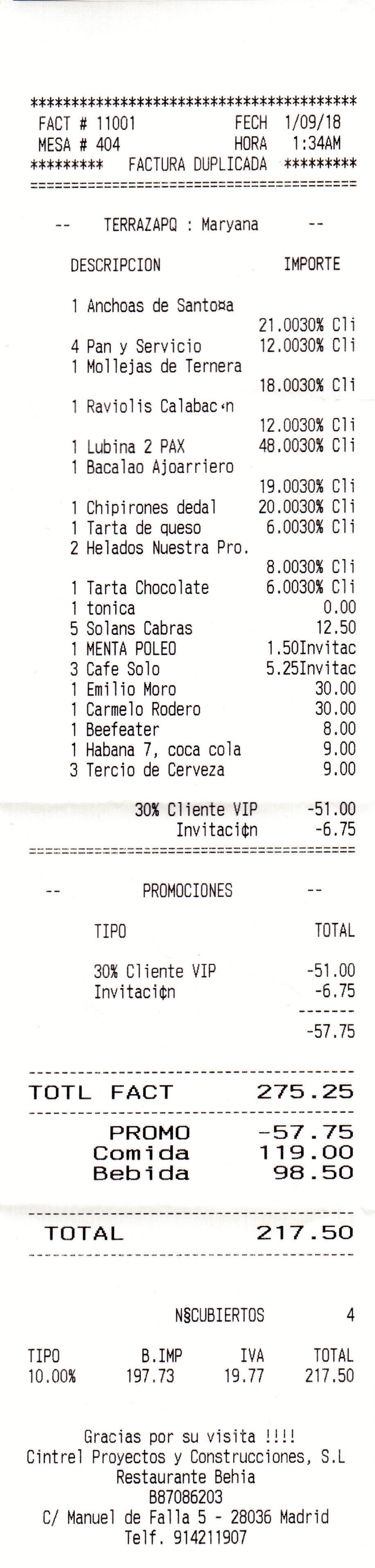 lo cobran a 3,50 € por comensal. En la factura cobran 3,00