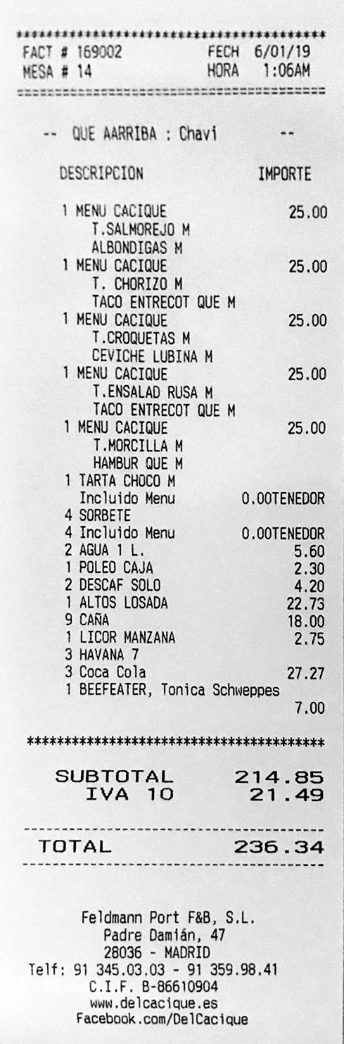 La carta y la factura: El menú contienen el I.V.A. incluido, sin embargo los precios de la factura no lo incluyen. La factura está correcta.
