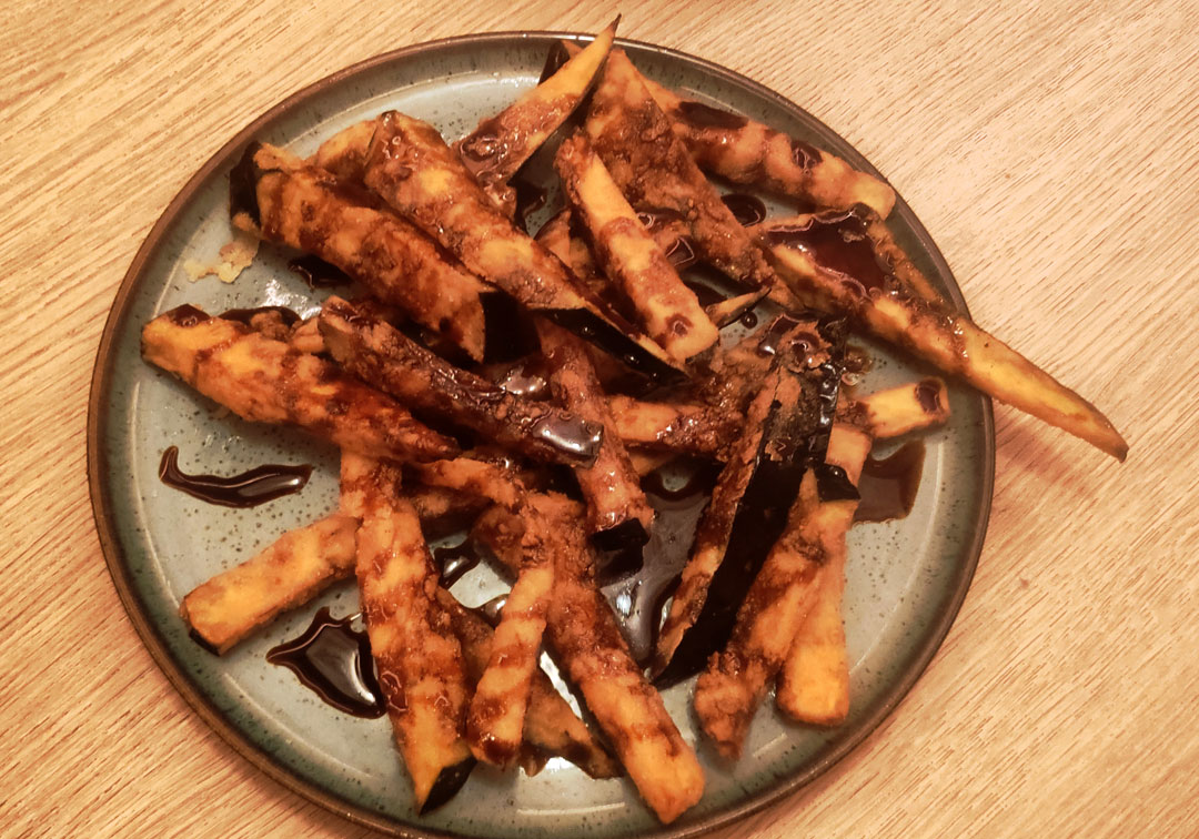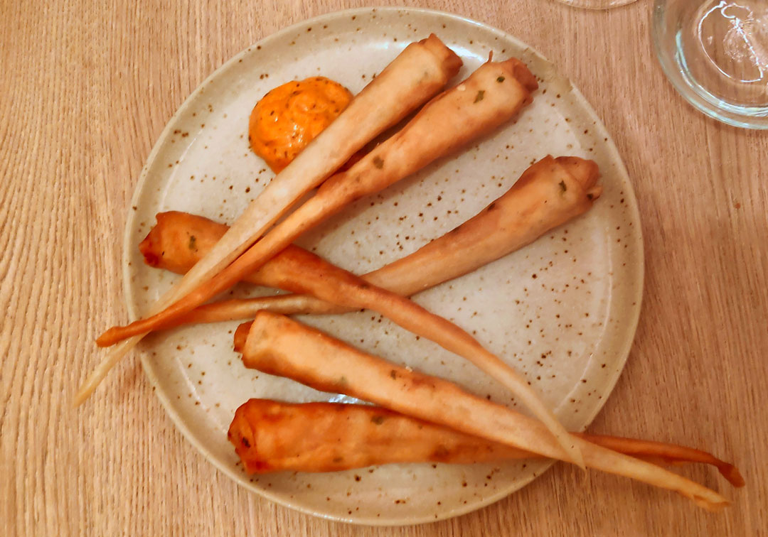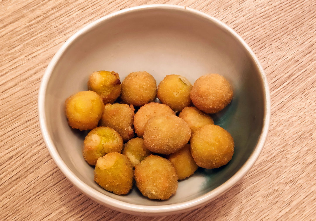 Con ellos pusieron de aperitivo aceitunas empanadas fritas. Algo