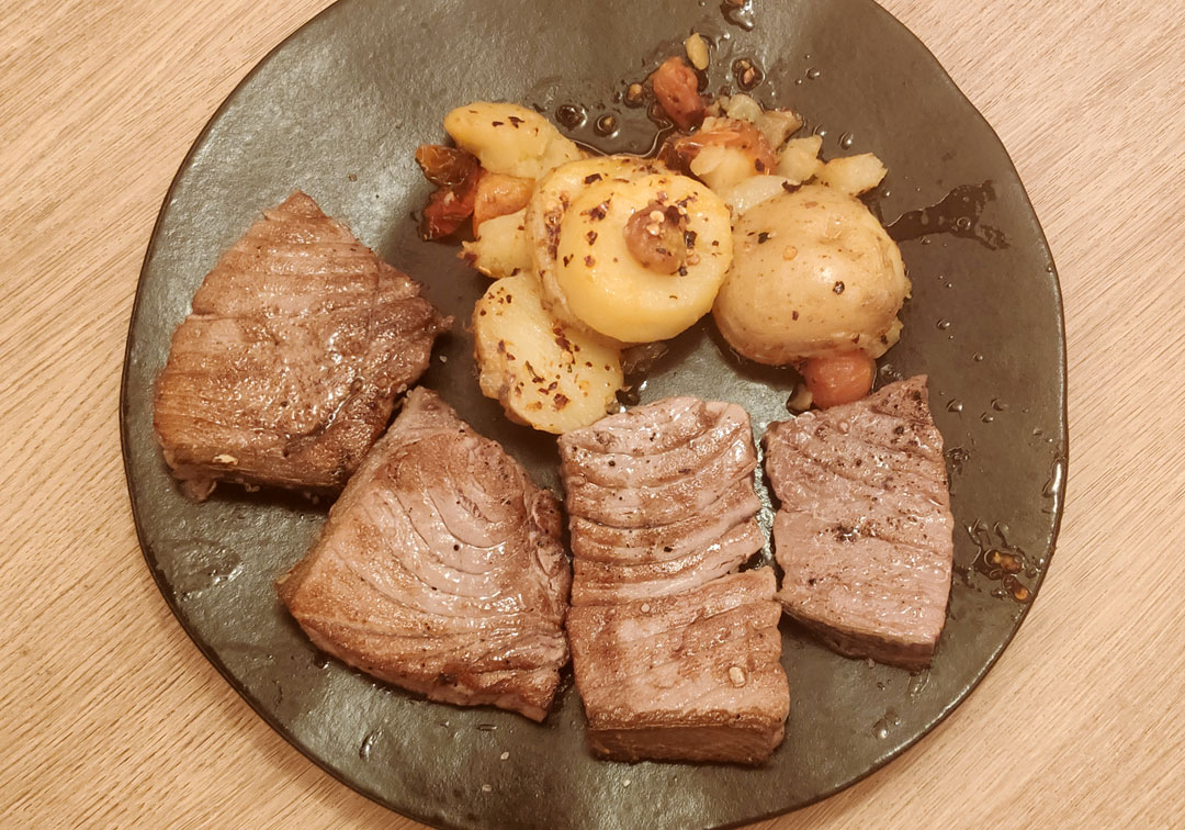 atún a la plancha acompañados de patatas cocidas. El tarantelo es