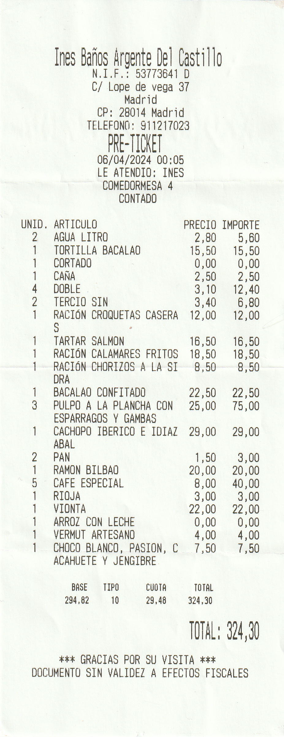 por comensal. Nos cobraron dos.