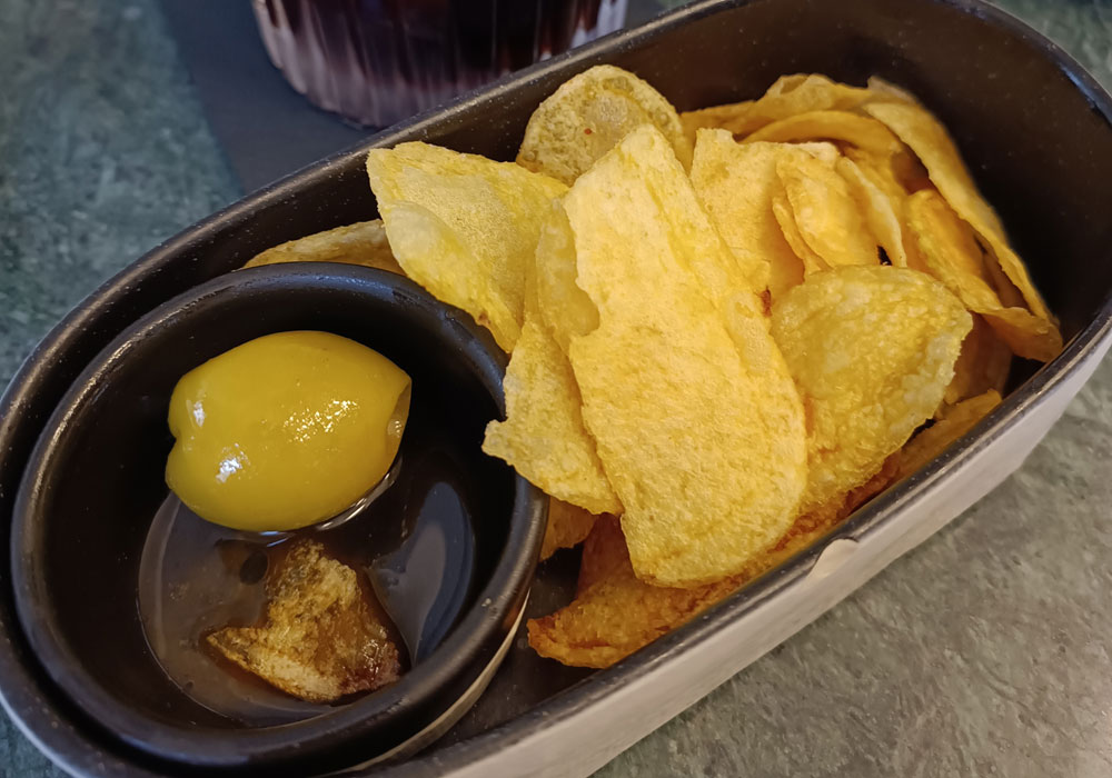 Pusieron unas aceitunas gordal y patatas fritas inglesas de aperitivo.
