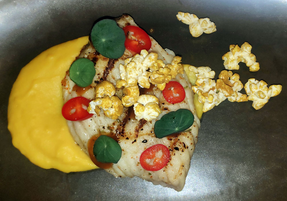 raya a la brasa, puré de maíz y palomitas especiadas: