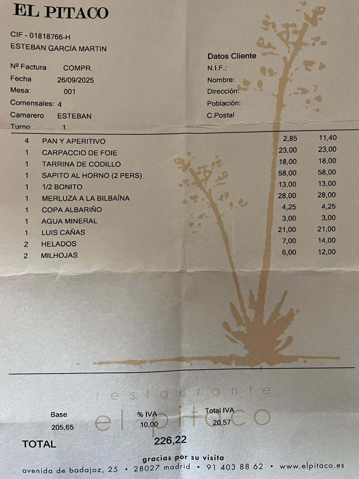 ni las copas, 197,97 €, el 87,5% son de la comida y