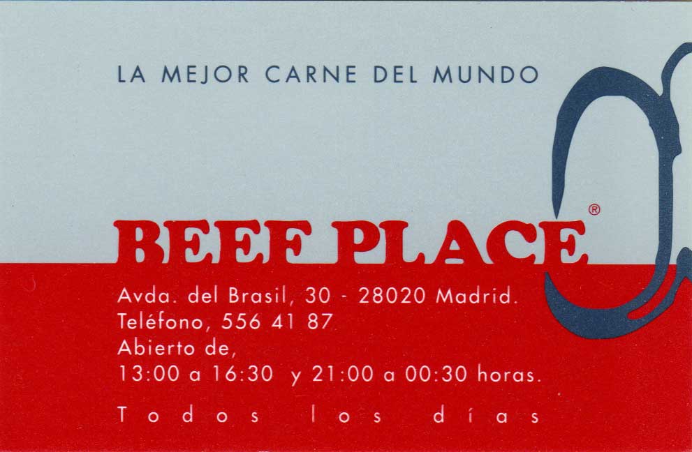 "En los Restaurantes Beef Place hacemos girar nuestro trabajo alrededor de una idea fundamental: la Honestidad sobre la Calidad. Por ello, llevamos 20 años fieles a nuestra filosofía. El pilar de nuestros restaurantes es la Carne de Vacuno criado en libertad y alimentado exclusivamente con pastos naturales de la Pampa Argentina. La mejor carne del mundo y biológica por naturaleza. Un producto excepcional que hacemos llegar a su mesa con el valor añadido que le aportan nuestras parrillas de carbón de encina y un servicio que destaca por su profesionalidad y amabilidad. Hemos elegido una fórmula moderna de gestión del producto, que nos permite controlar desde su origen más de ocho mil cabezas de ganado de las razas Angus y Hereford, su alimentación natural y la importación directa hasta nuestros restaurantes. Lo que nos sitúa en una inmejorable posición para ofrecer a precios competitivos una calidad y una regularidad garantizada. Además de la trazabilidad certificada de nuestros productos."