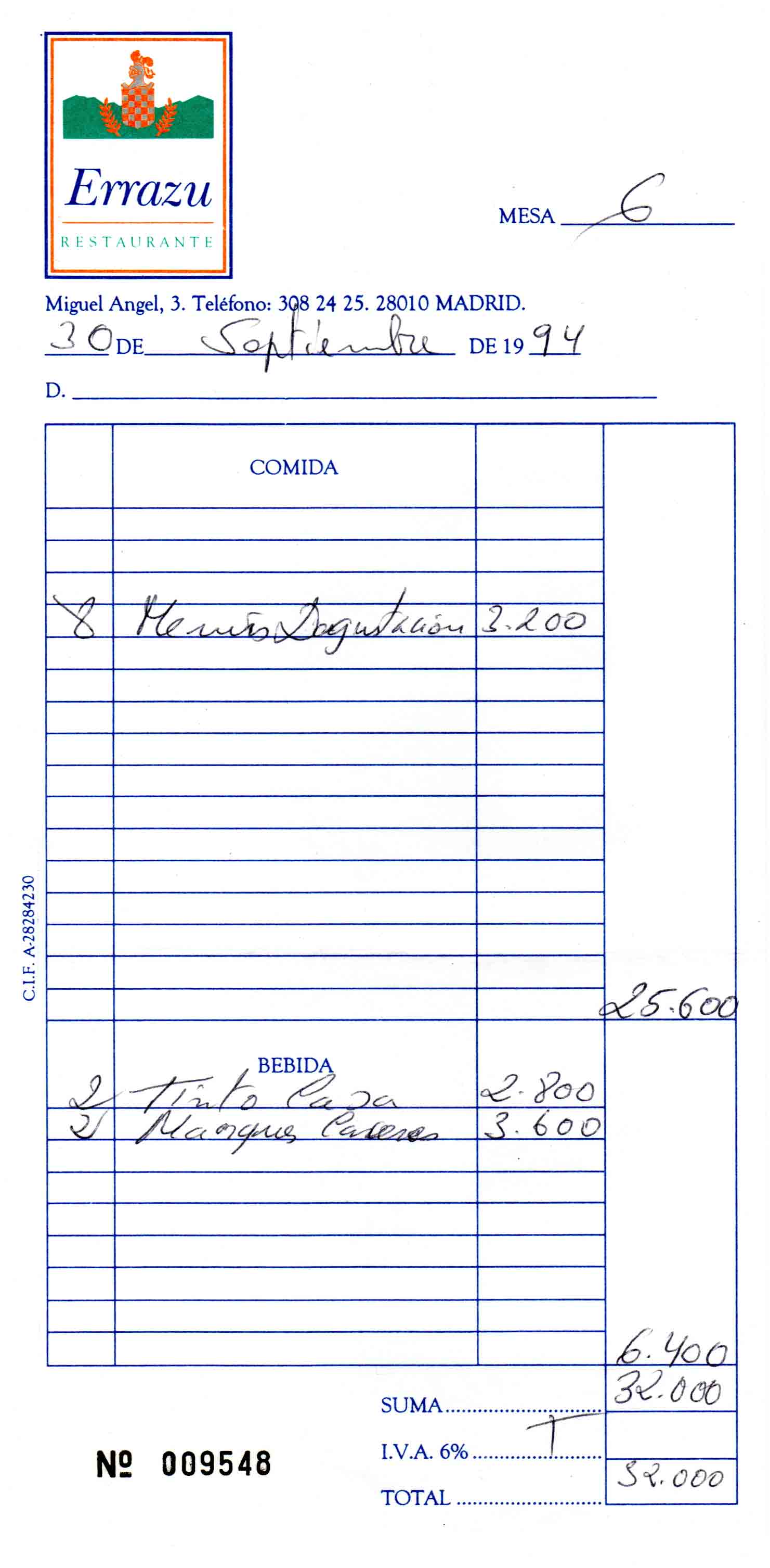 la factura (3.200 pts), y tampoco incluia vino.
