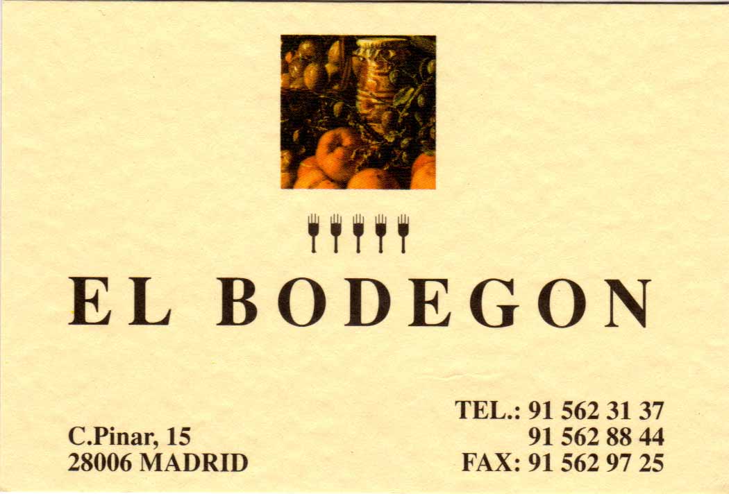 "El Bodegón esta considerado como uno de los grandes de Madrid. Un estandarte de la alta cocina tradicional elaborada con la creatividad de un cocinero de prestigio internacional, Hilario Arbelaitz. Inaugurado en 1956, este clásico de la cocina española cuenta con la larga experiencia de José Machado como jefe de cocina. El ambiente tranquilo, el servicio exquisito, los monográficos de recetas elaboradas con productos de temporada, la amplia y variada bodega y una magnífica colección de obras de arte distribuidas por el local, hacen de cada visita a El Bodegón una experiencia gastronómica inolvidable. El Bodegón tiene una capacidad para 60 comensales y cuenta con un magnífico reservado para 28 personas en el que podrá disfrutar de unos menús confeccionados especialmente para usted. Disponible cena degustación."